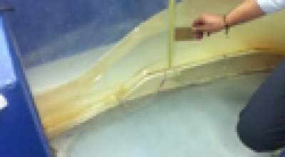 Submerged flow conditions require not only that the Ha level be measured, but also the Hb level be measured. In a Parshall Flume, the Hb location is towards the end of the throat. This location is, however, quite turbulent - making accurate level measurement difficult. Hb readings are, therefore, usually taken in stilling wells, where the level is more easily determined than in the main flow stream. Practically speaking, the upper limit for correctable submerged flows is 90%. Above this point and wave action in the throat makes accurate level measurement exceedingly difficult.