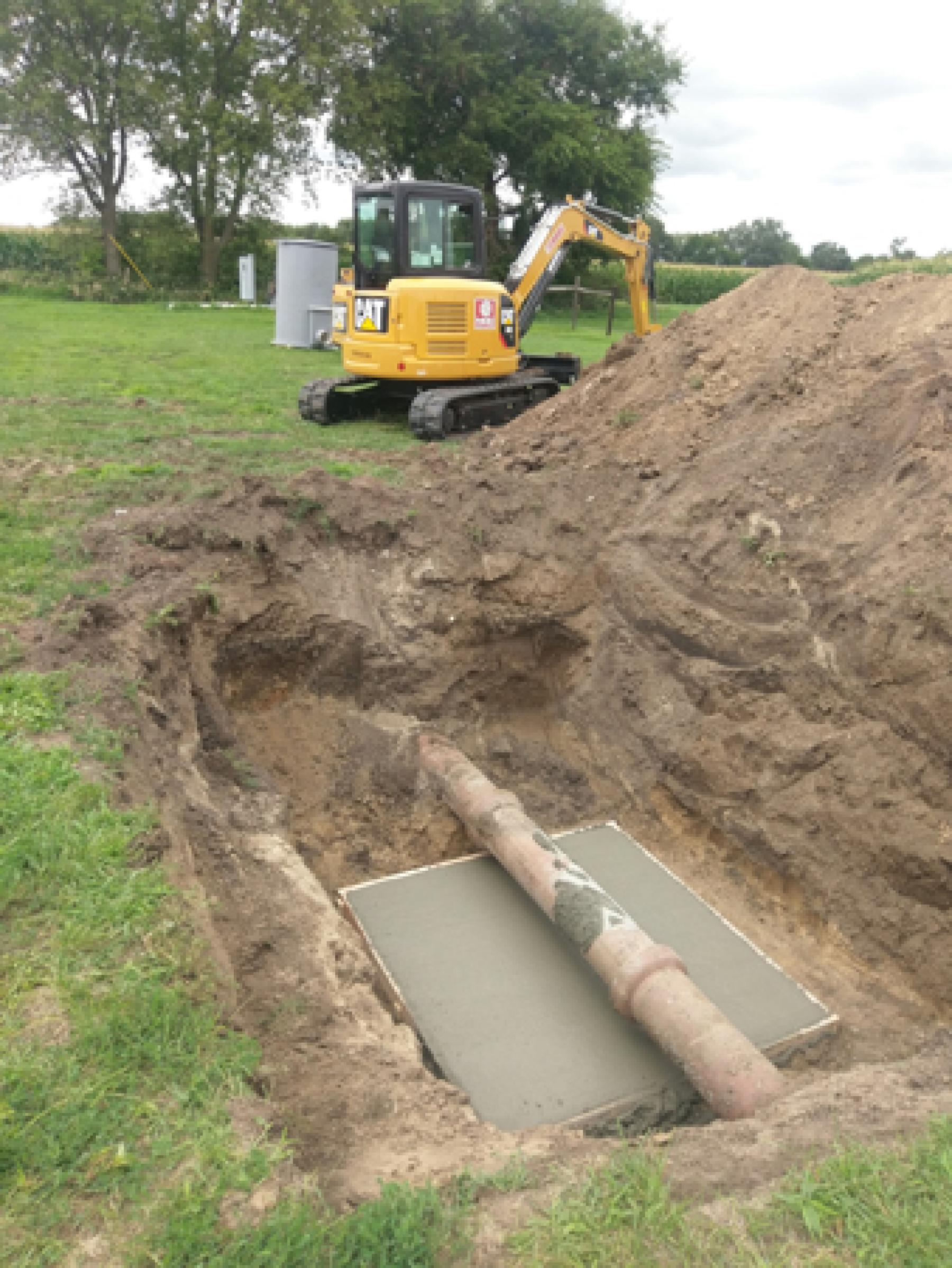 With the manhole now on the mounting pad, the structure can be moved into position for connection to the existing piping. It is usually recommended that some space be provided between the pipe and the manhole's stubs. Here the connection between the pipe and the manhole is accomplished with flexible Fernco couplings.