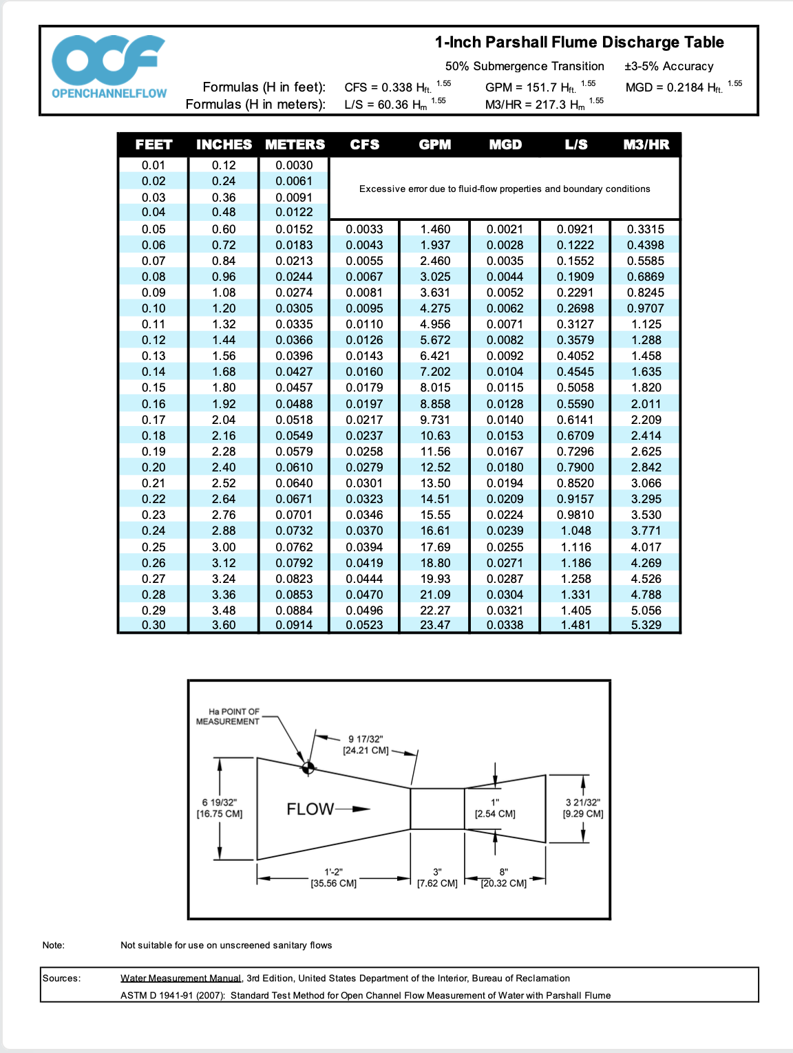 The free flow discharge table for the 1-inch Parshall is available for download.