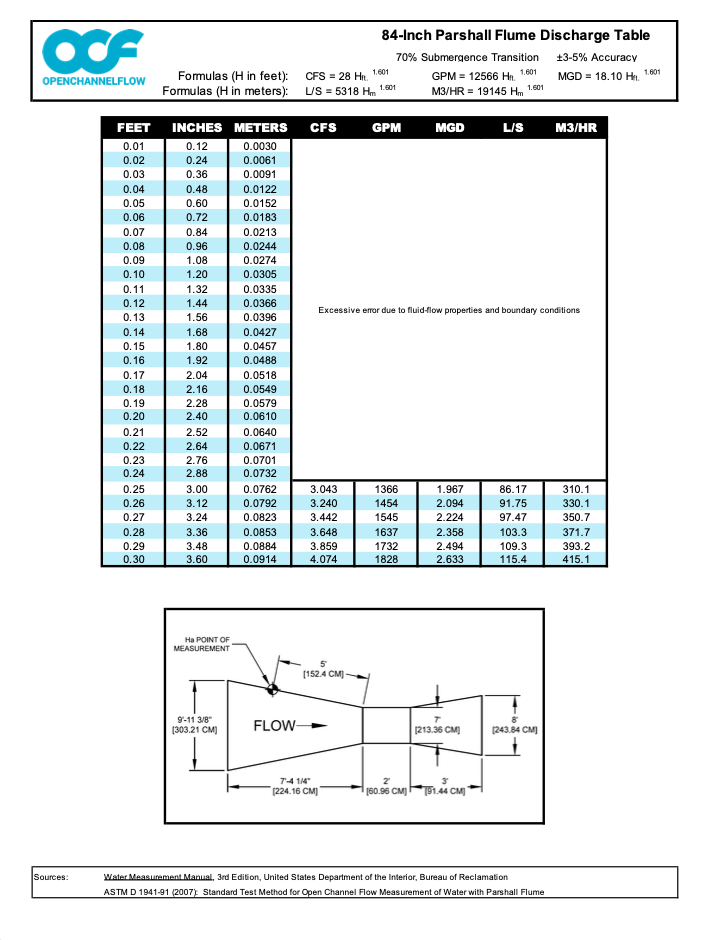 The free flow discharge table for the 84-inch Parshall is available for download.